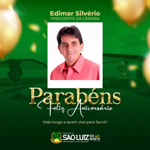 Hoje é dia de parabenizar o Presidente da Câmara Municipal Edimar Silvério.Parabéns! Muitas felicidades, saúde, sabedoria, muito sucesso e que Deus continue iluminando seus passos para que você realize todos os seus sonhos. São os votos do administração Municipal de São Luiz do Norte.